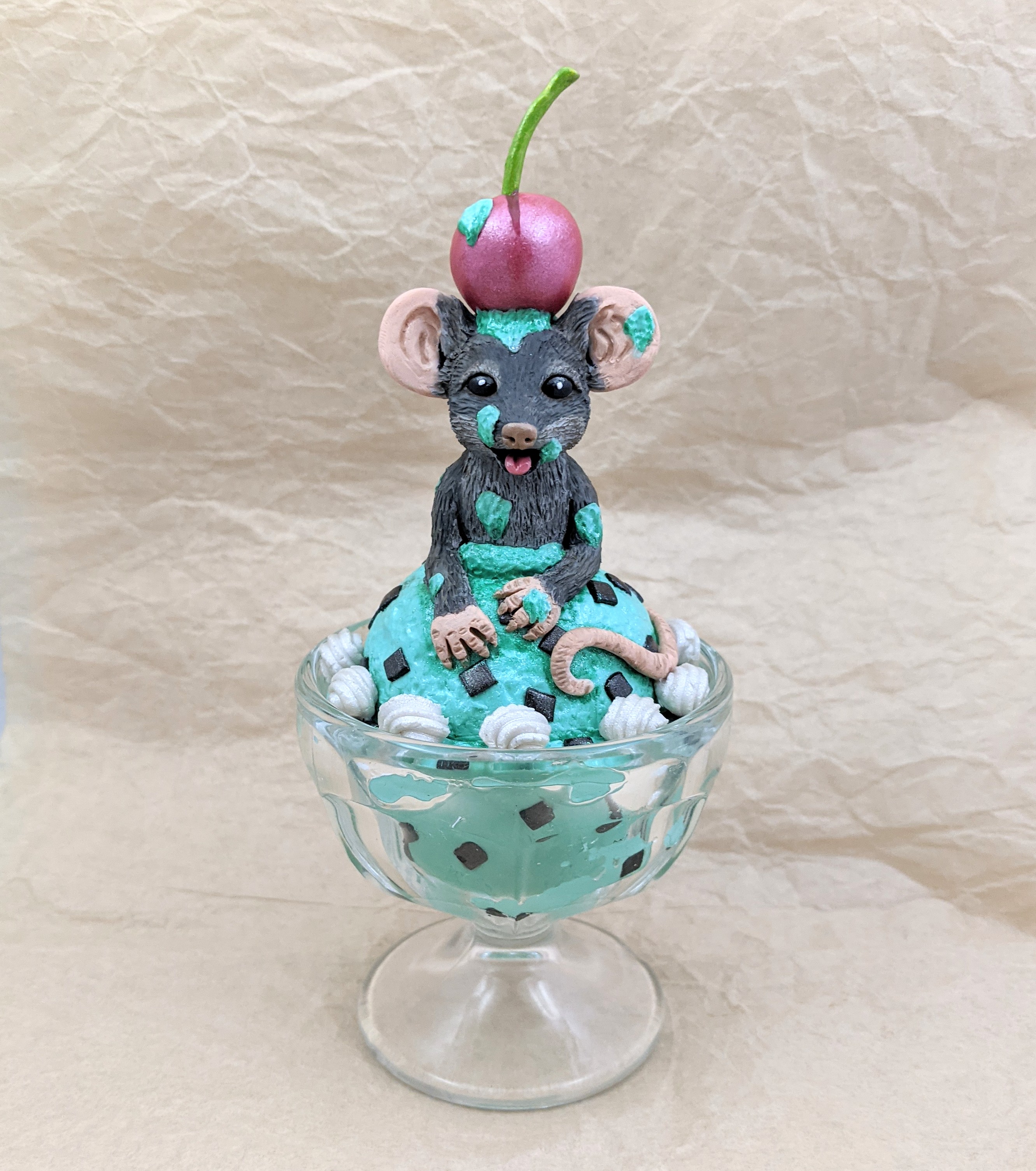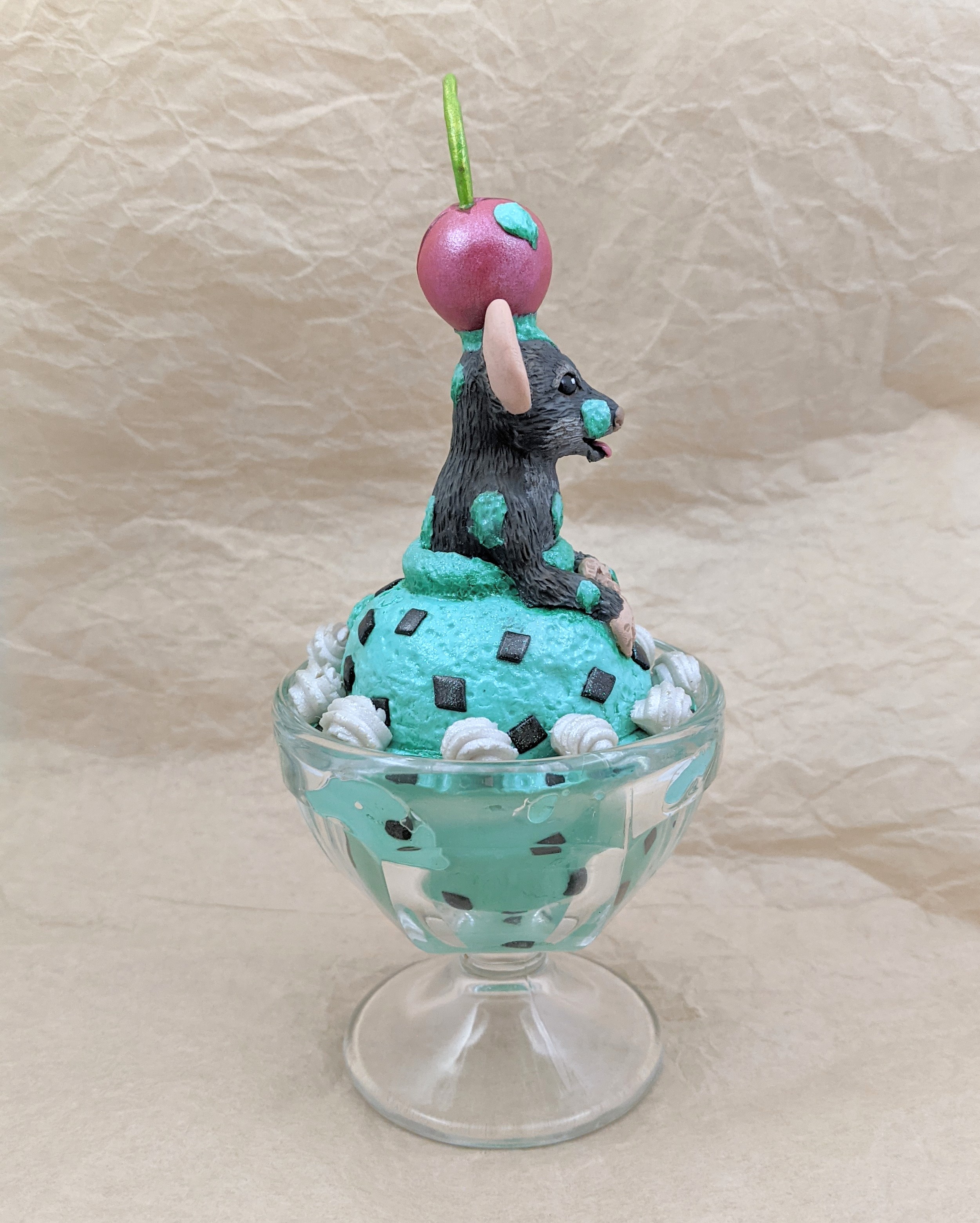 ~Pipsqueak is hand sculpted from Cosclay polymer clay and hand painted with acrylics. He is in a real glass ice cream dish.