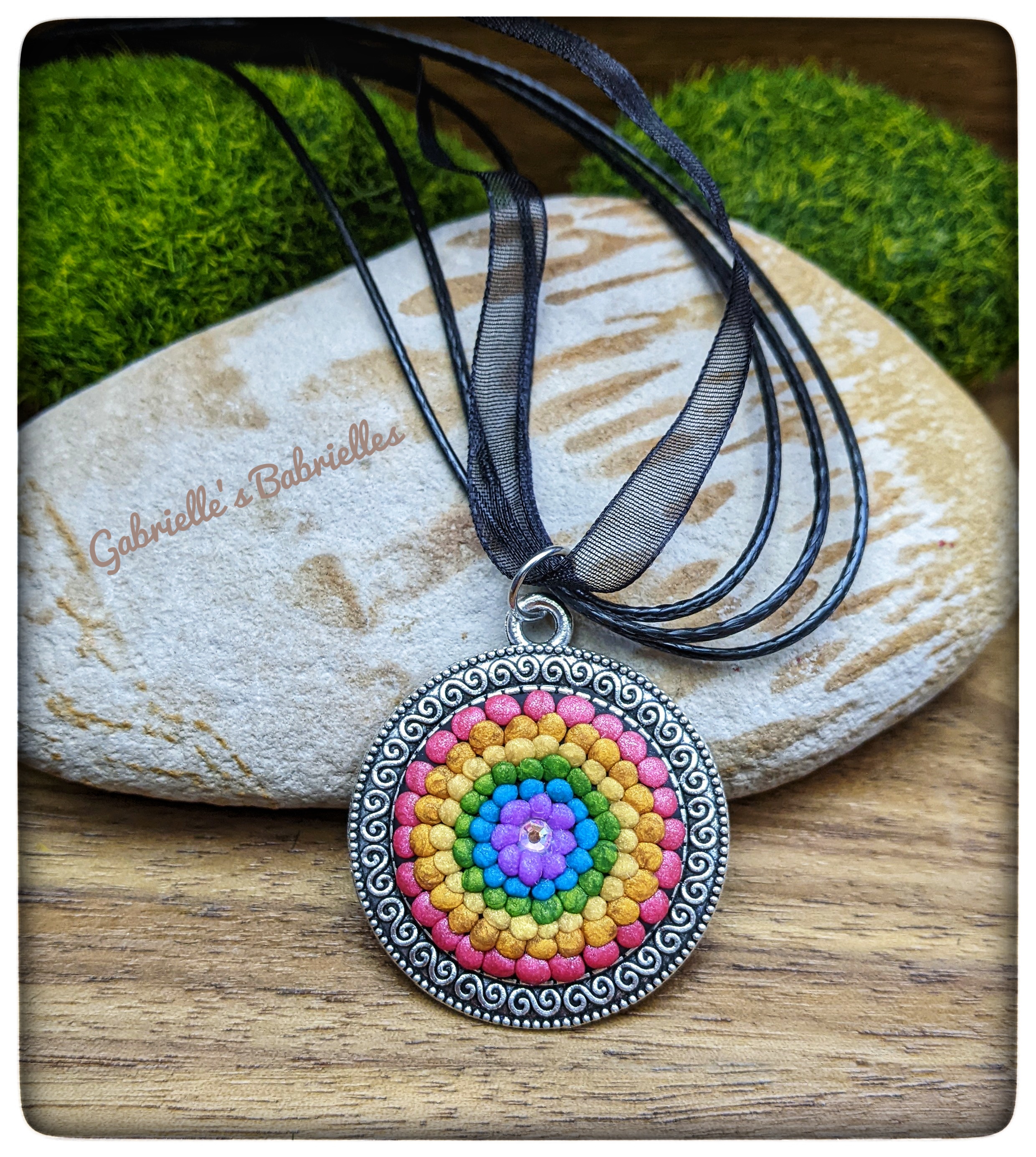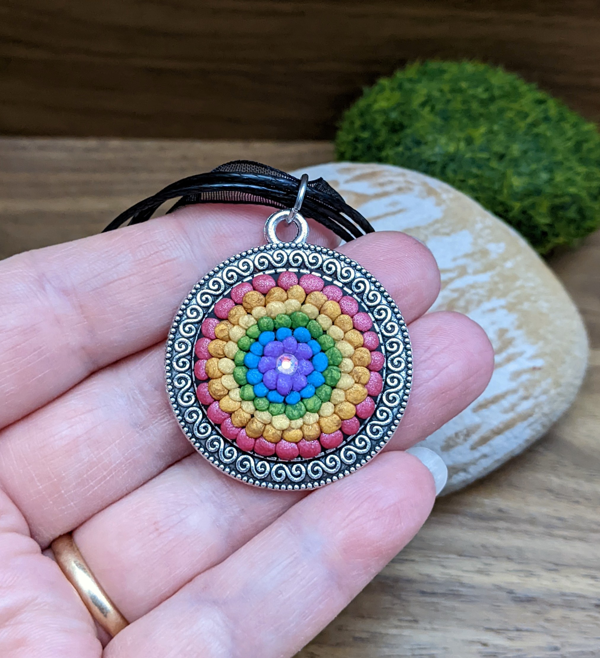 Rainbow Mandala pendant necklace, hand sculpted from polymer clay onto a metal bezel.