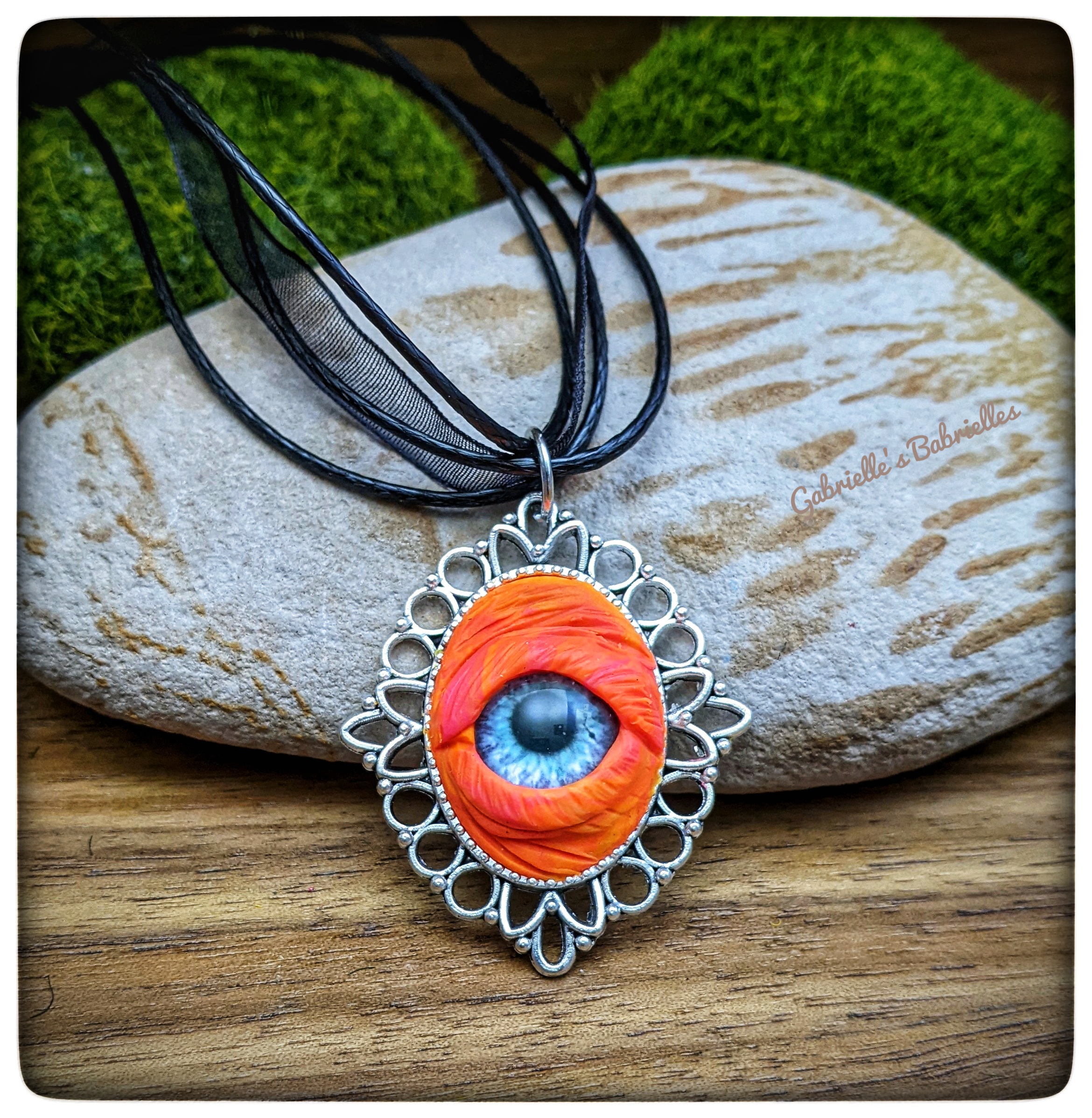 Eye necklace pendant orange blue realistic polymer clay sculpture jewelry