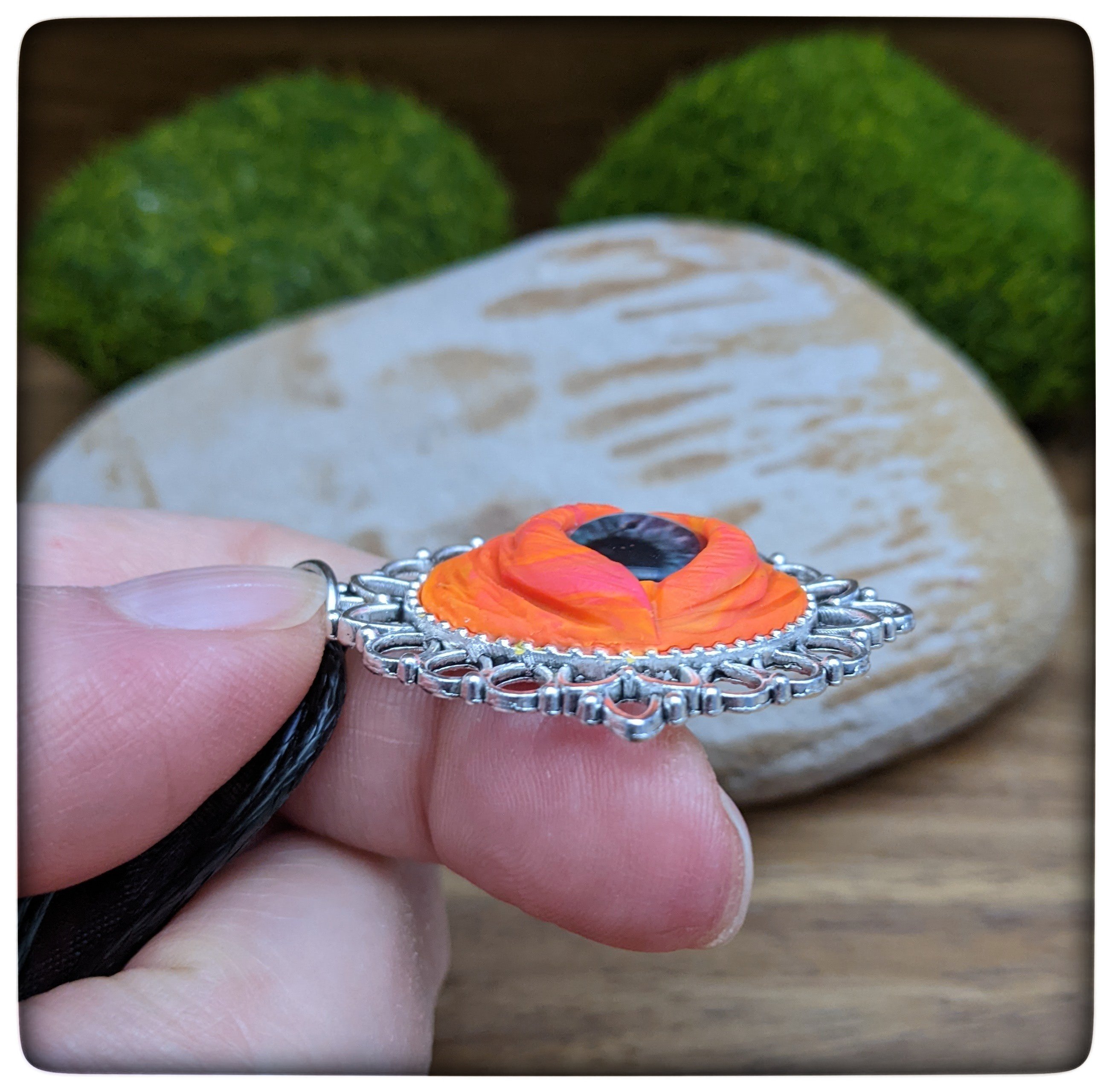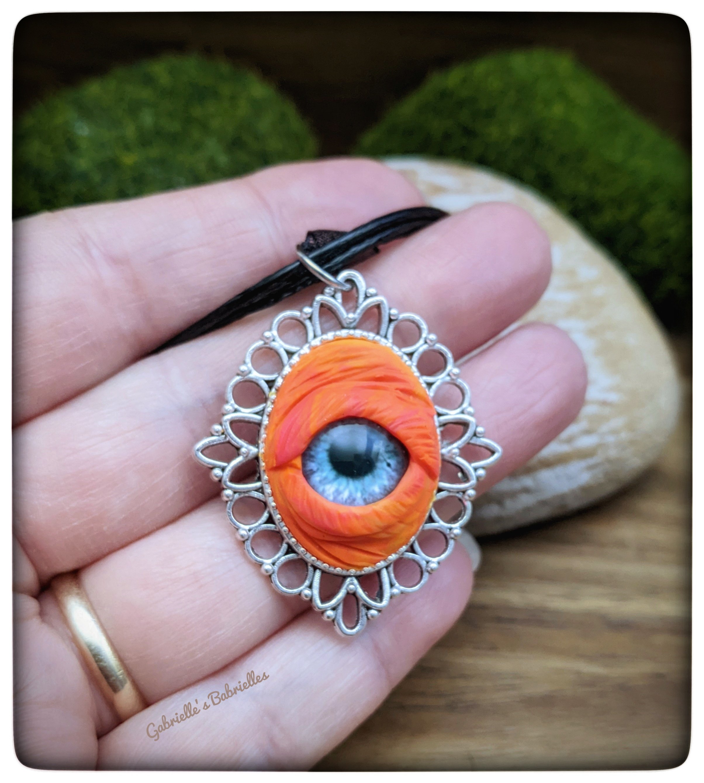 I sculpted this realistic Eye pendant from orange polymer clay onto the metal bezel. It has a glass cabochon blue eye. Black ribbon cord included.