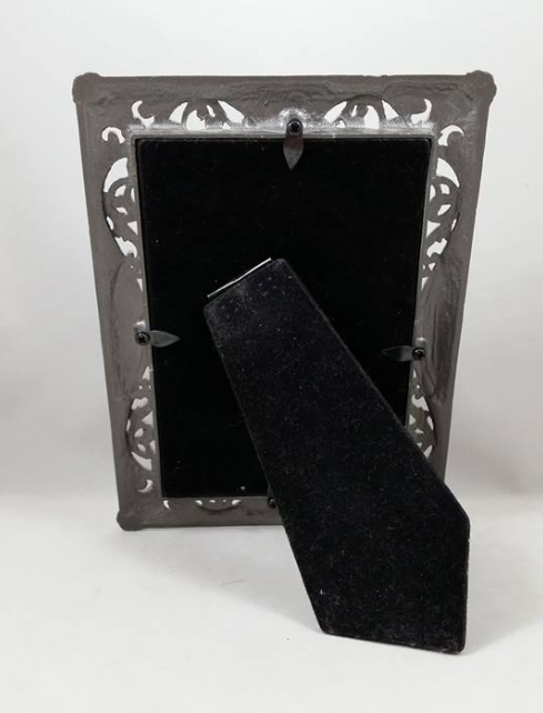 ~ The metal frame is very heavy and has Faux Mother of Pearl, and faux diamonds set in all sides and corners. It is 5 1/4 inches wide by 7 1/4 inches tall.