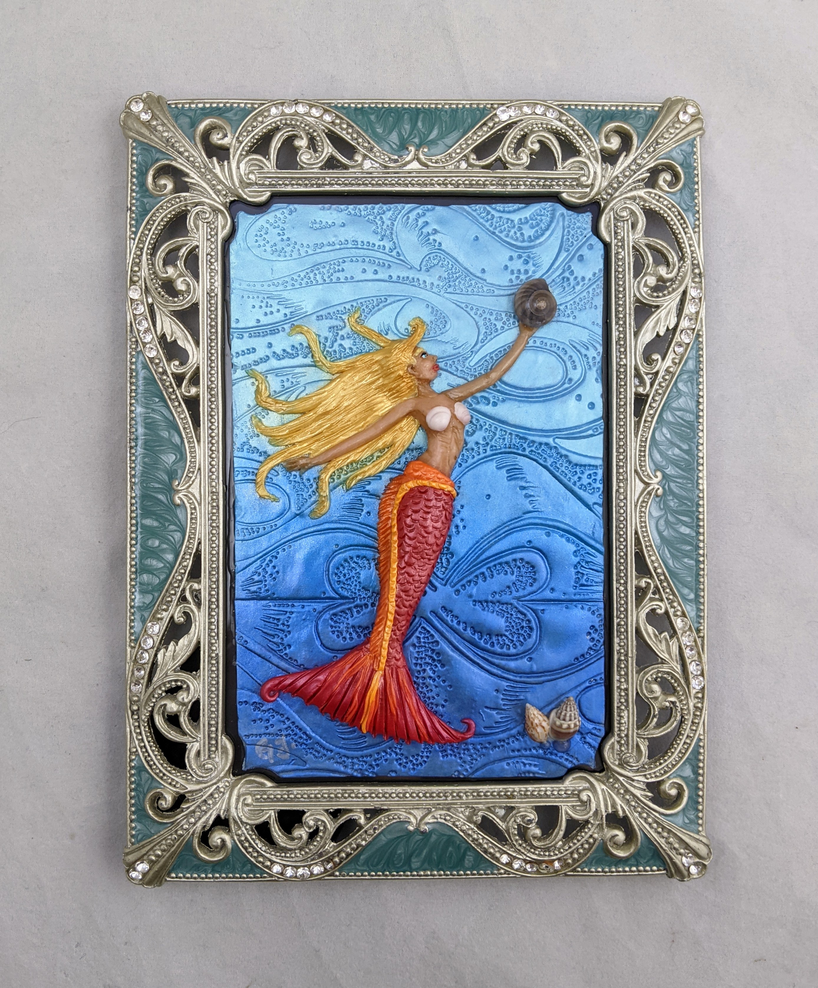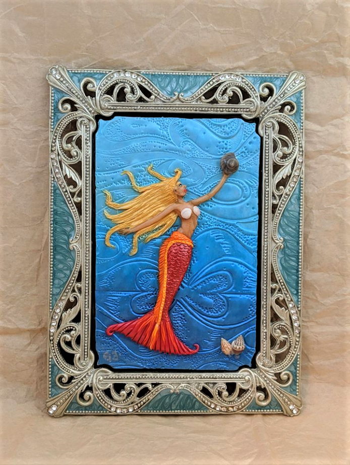 ~ This Mermaid is hand sculpted from polymer clay on a polymer clay background. She is dusted with Pearlex Powders for a shimmery and colorful effect. She has real sea shells on her bosom, and is holding a real sea shell in her hand. The shells on the bottom right of the piece are real as well.
