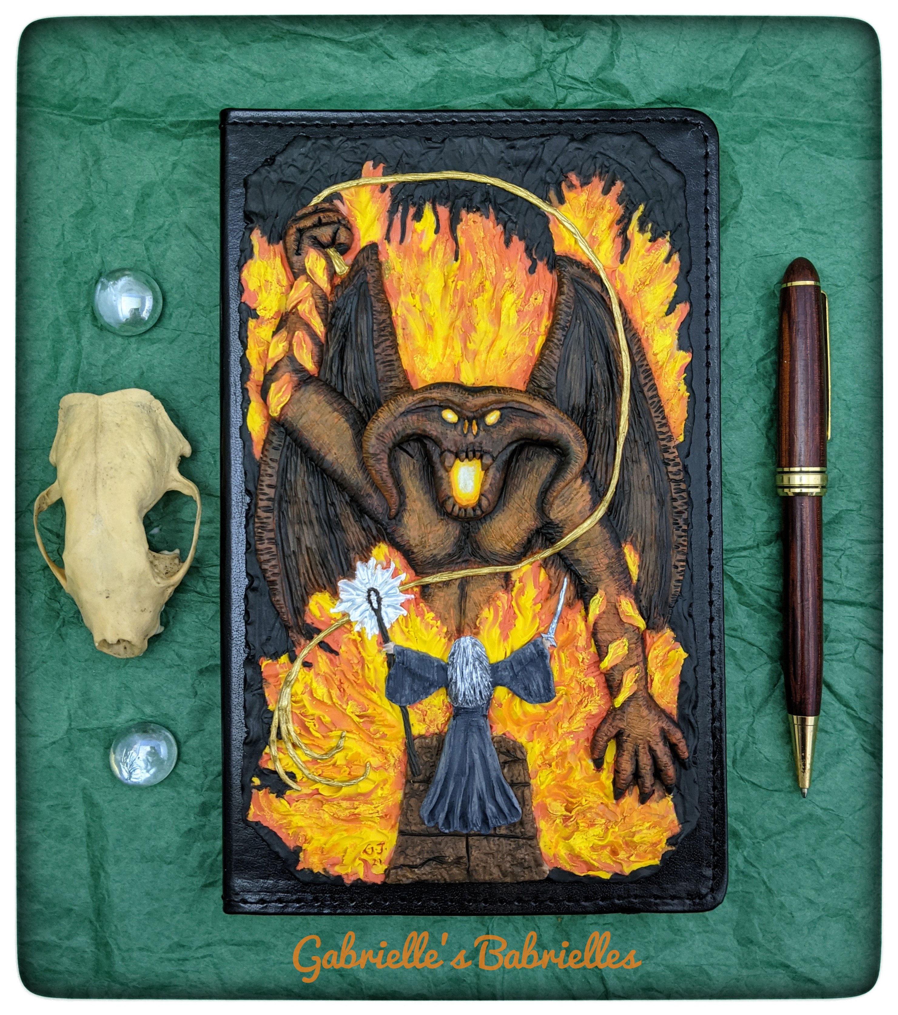 ~This Gandalf and Durin's Bane Balrog journal cover is made from Cosclay, a new polymer clay that remains strong and flexible after curing. It is painted with acrylics. I sealed it with a matte varnish, and a satin varnish on the shimmery bits like Gandalf's hair, his sword, the light from his staff and the Balrog's whip.