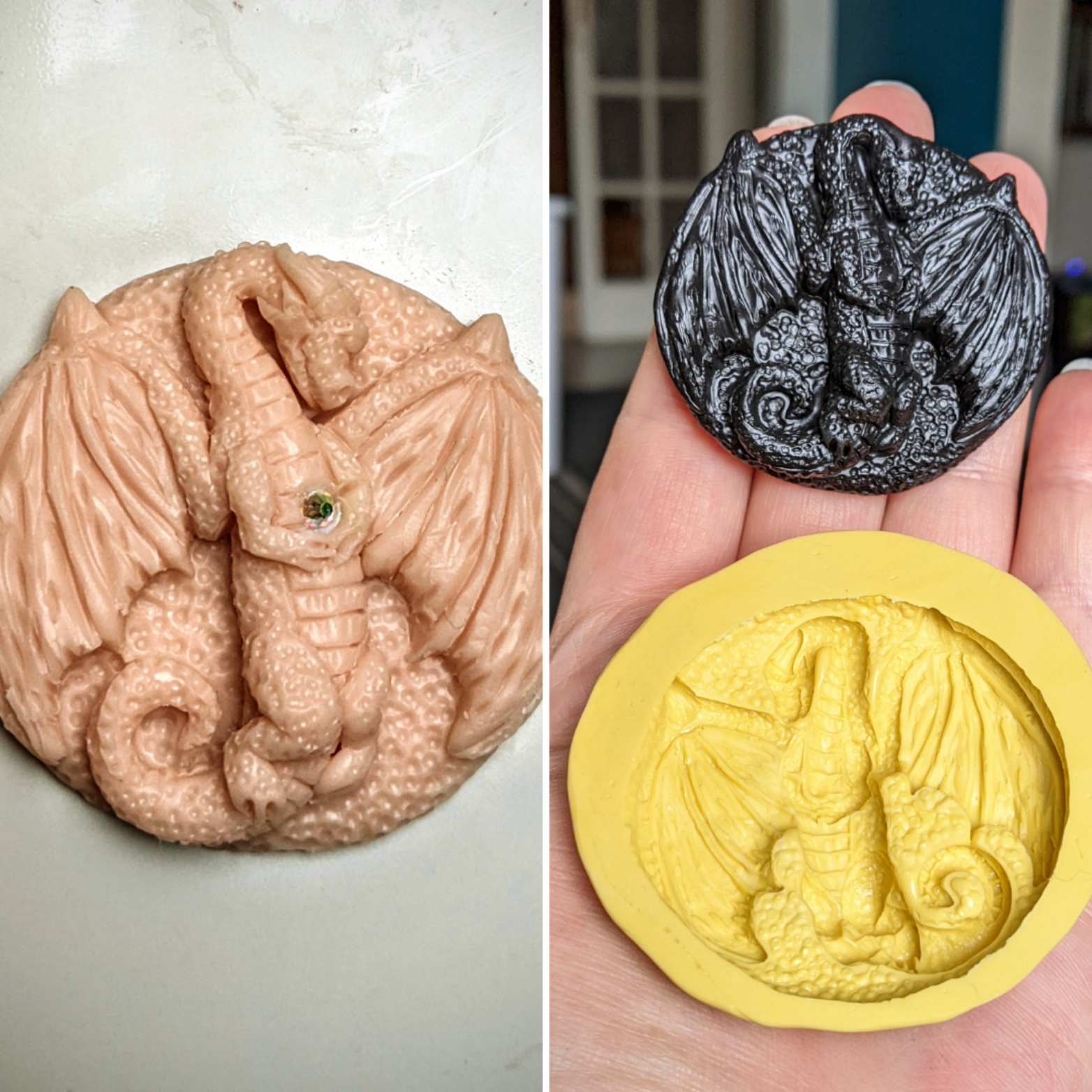 I hand sculpted a dragon and then made a mold. Then I made a pressing and painted it with pearl powders. I added a glass gem. Bake and seal. Glue a magnet on back and voila! Dragon magnet 🧲