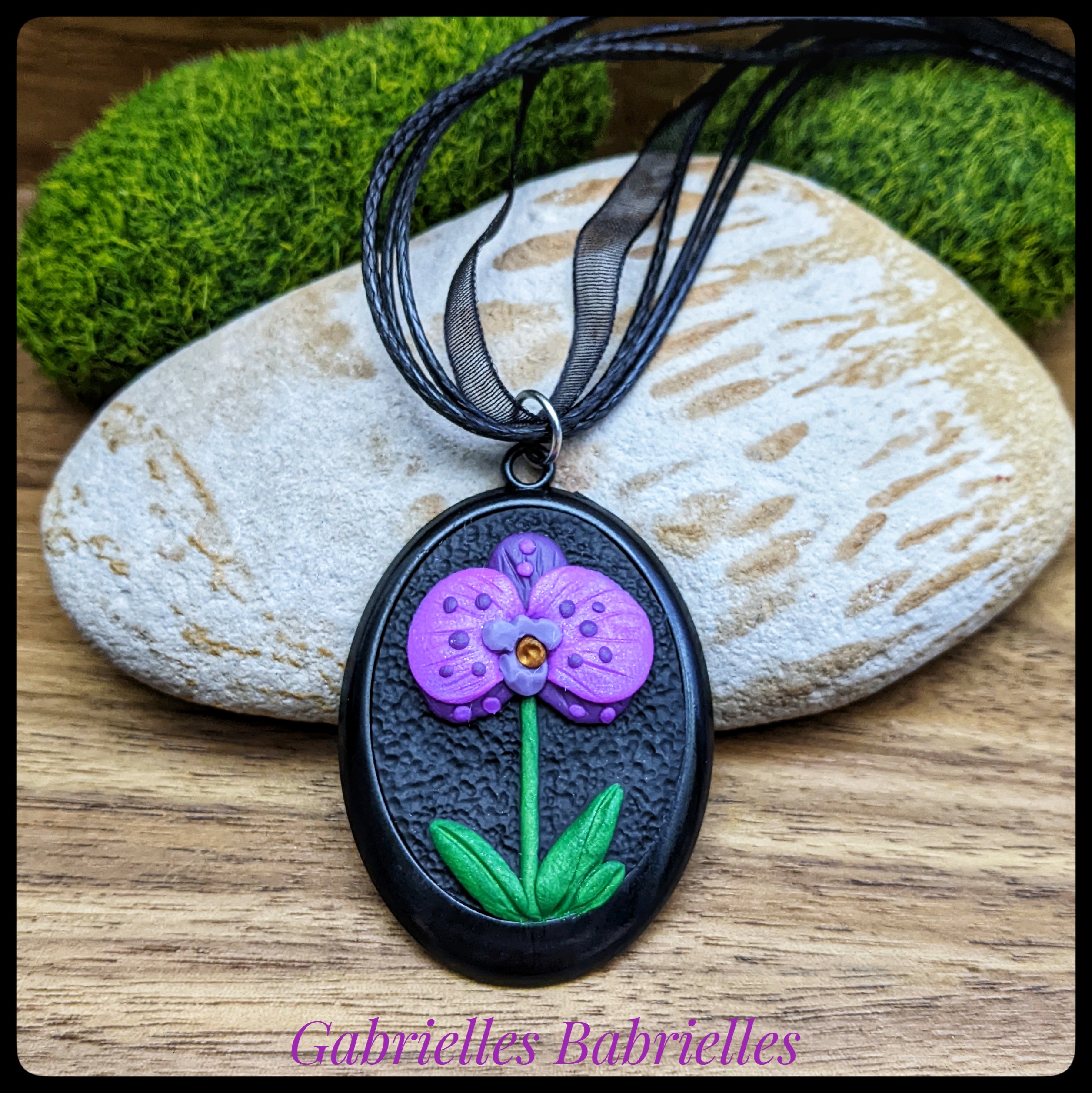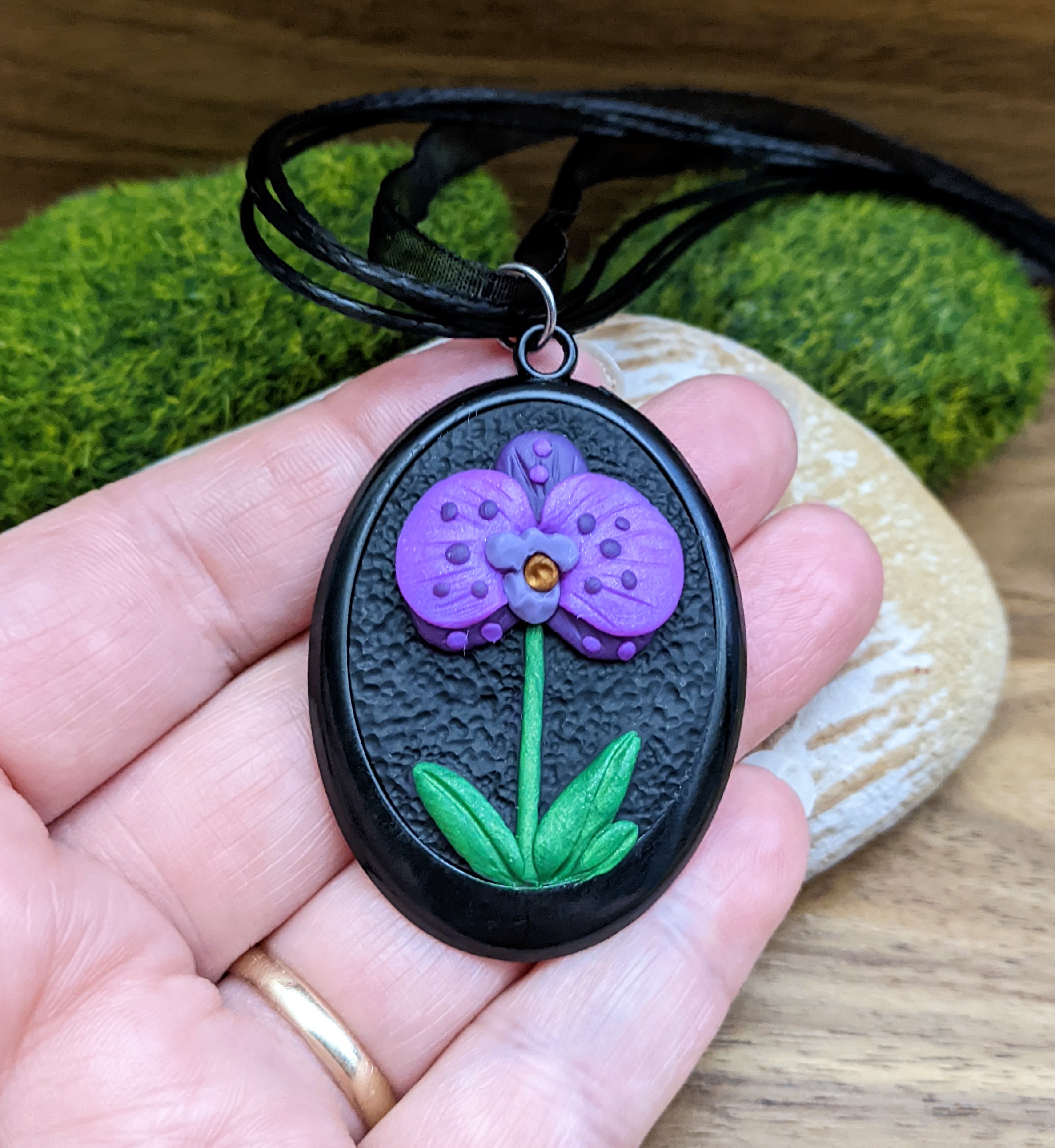 I hand sculpted this orchid pendant from colored polymer clay directly into the black metal bezel.