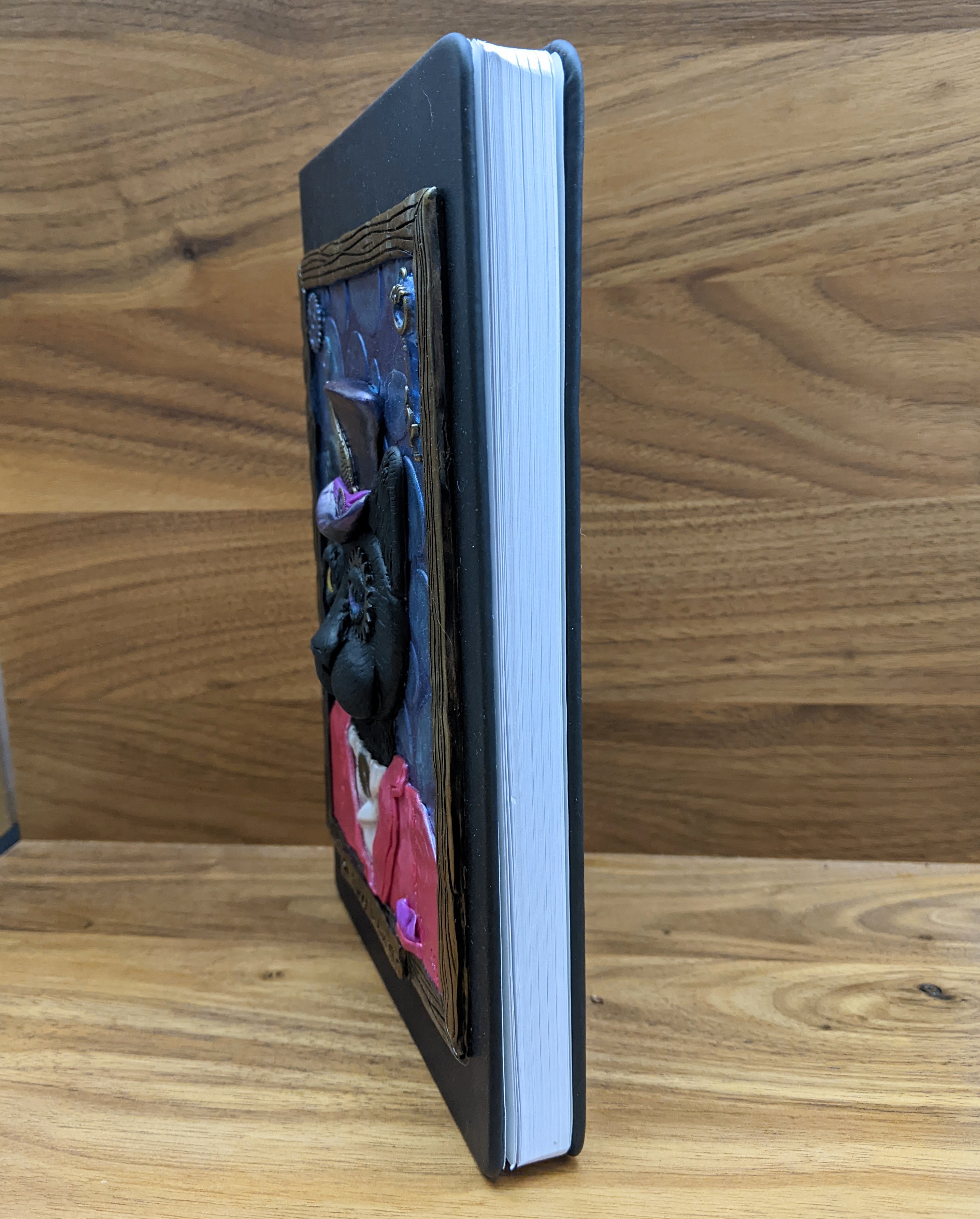 Sir Purcy is sculpted from polymer clay, and colored with Pearlex powders. I used real glass eyes and metal gears and earrings. He is securely affixed to the notebook.