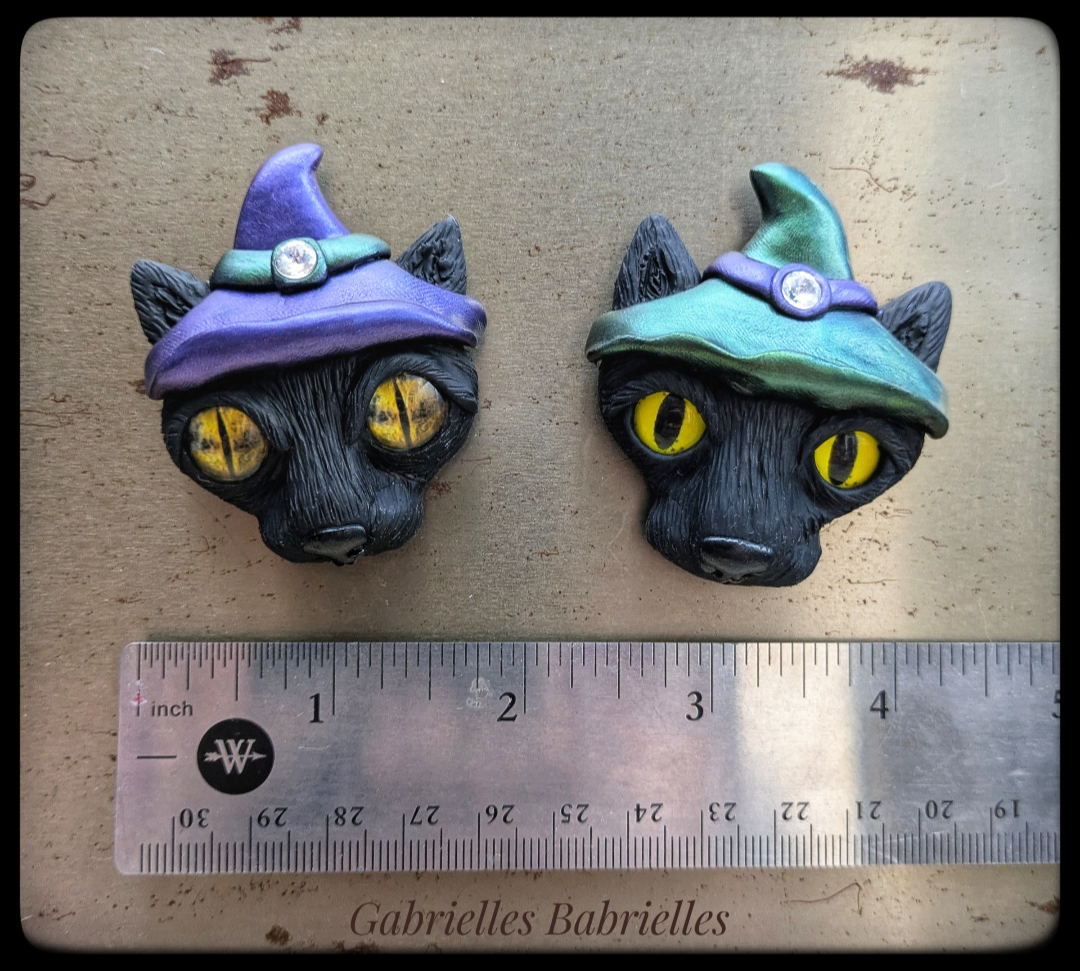 I hand sculpted these two from polymer clay. They have real glass eyes, glass diamonds, mica powders, strong ceramic magnets on back, and love.